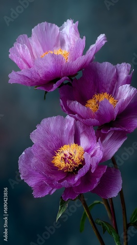 Fototapeta premium Three elegant, fully bloomed pink peonies with delicate petals and yellow centers are set against a dark, moody purple background with light.