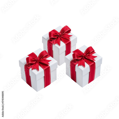 © arthit, Obraz premium Three Elegant White Gift Boxes with Red Ribbons Over a Clean Background for Celebrations and Special Occasions