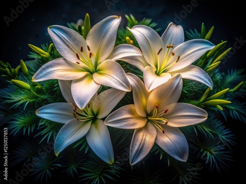 © ChannelPIC, Fototapeta premium Three elegant white lilies, stark against a shadowy landscape, viewed from above.