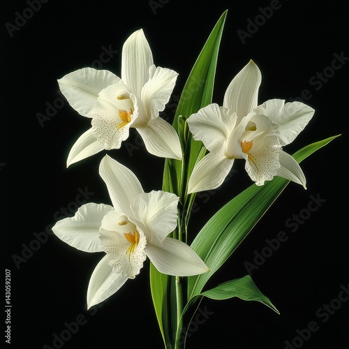 © Vangly, Fototapeta premium Three elegant white orchids against a black background.