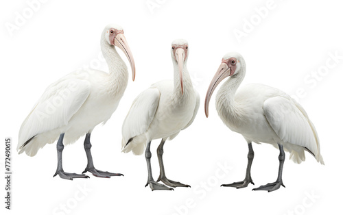 Fototapeta premium Three elegant white pelicans standing in perfect alignment on shore