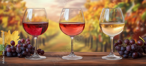 Fototapeta premium Three elegant wine glasses with grapes on wooden table