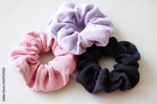 © Azrulla, Obraz premium Three fabric hair ties in pastel shades