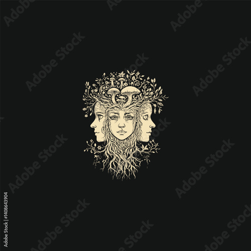 © Seraphyn, Fototapeta premium Three faces queen with natural leaf and mushroom ornament design vector template illustration