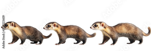 © Oulaphone, Obraz premium Three ferrets with brown and white fur, walking in a line facing left. Png, Transparent background.