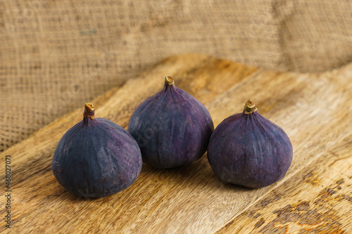 Fototapeta premium Three fig fruits on old wooden chopping board.