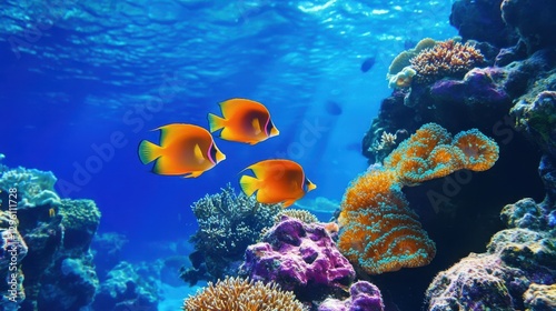 Naklejka premium Three fish swim gracefully near vibrant coral in clear water, showcasing the...