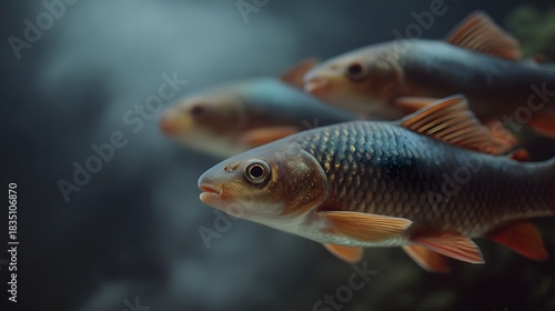 Fototapeta premium Three fish swim together in dark moody underwater lighting their scales catching a subtle shimmer