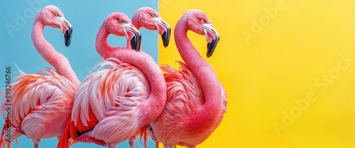 © Artur Lipiński, Obraz premium Three Flamingos Against Blue and Yellow Background