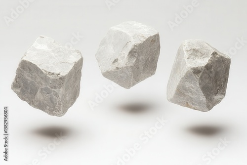 © Sarinya, Naklejka premium Three floating marble stones casting shadows on a white background in a studio setting with soft lighting and a minimalist style