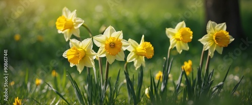 © Den Boro Day, Fototapeta premium Three flower daffodils in spring outdoors in grass in the sun close-up on green blurred background A beautiful spring template for design.