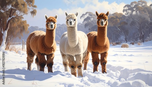 © Sena, Naklejka premium Three fluffy camelids of varying colors stand proudly in a snowy landscape. The winter scene includes trees and a clear, blue sky