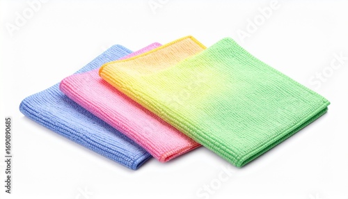 © Haven, Fototapeta premium "Three folded microfiber cleaning cloths side by side on neutral surface, each a different color—blue, pink, and green—soft textured material suitable for scratch-free surface cleaning, household supp