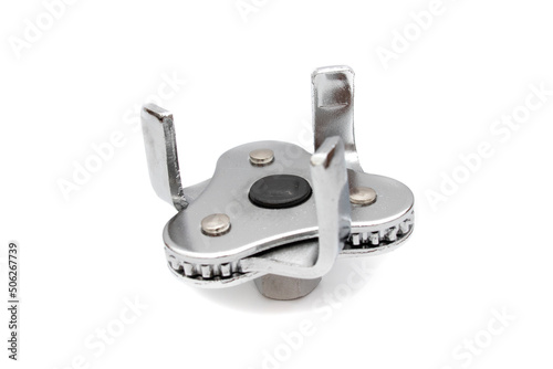 © mialcas, Obraz premium Three foot oil filter wrench. Isolated on white background. Most effective wrench to change the oil filter of a vehicle.
