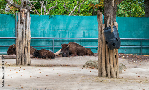 © Denis, Fototapeta premium Three forest bison are lying on the ground