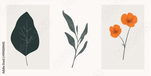 © kkkiim graphic, Fototapeta premium Three frame featuring a dark green leaf on a white background, an orange petal flower on a light gray background