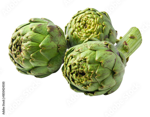 © Catur, Fototapeta premium Three fresh artichokes, green and spiky, arranged on a black background