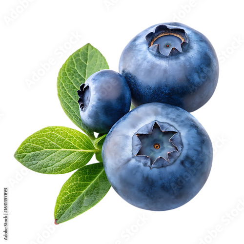 Obraz premium Three fresh blueberries with green leaves isolated on transparent background
