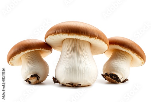 © Agus, Fototapeta premium Three fresh brown porcini mushrooms with white stems and visible soil on a white background