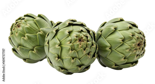 © shornagraphiclab, Fototapeta premium Three fresh green artichokes with layered petals and stems isolated on transparent background