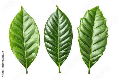 Fototapeta premium Three fresh green coffee leaves isolated on black background botanical study