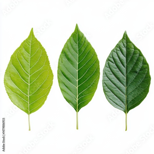 © Rashid, Fototapeta premium Three fresh green leaves in a row, isolated close up view on white background