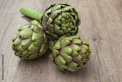 Fototapeta premium Three fresh organic purple artichokes with stem on a rustic wooden surface...