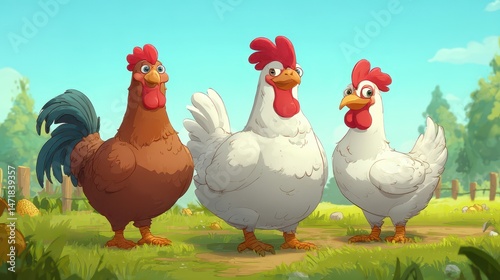 © RizArt, Fototapeta premium Three friendly farm fowl in a sunny pasture.