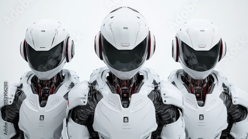 © chusnul, Fototapeta premium Three futuristic robots with sleek designs and headphones against a minimalist background.