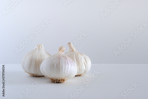 Obraz premium Three garlic and garlic cloves isolated on a white background