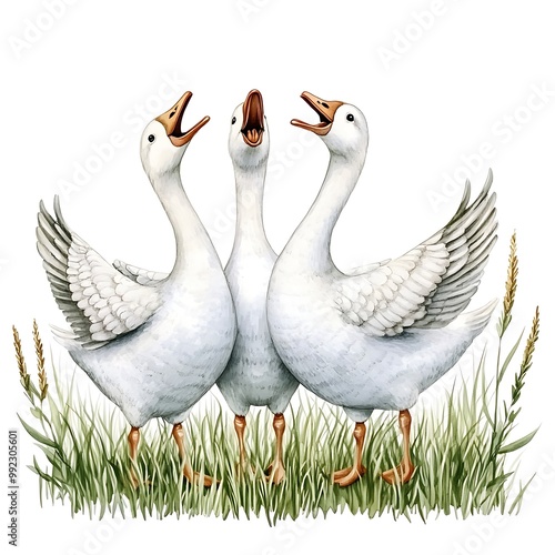 © NatthaphonSiri, Obraz premium Three Geese Standing in a Row, Watercolor Illustration.