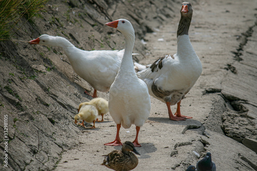 © jokuephotography, Fototapeta premium Three geese with two babys