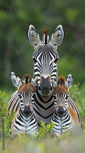 Obraz premium Three gentle zebras in the wild create a touching moment of unity, ideal for...