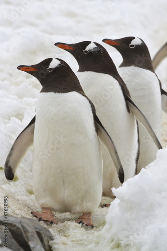 © Tarpan, Fototapeta premium Three Gentoo penguins standing on the road