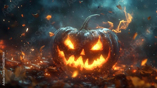 © jiraphat, Naklejka premium Three ghostly figures are floating in a room with flames. Scene is eerie and spooky