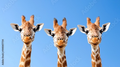 Naklejka premium Three Giraffes Smiling, Blue Sky Background