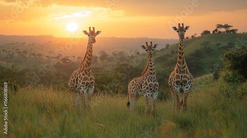 © munha, Obraz premium Three giraffes stand in tall grass at sunset, overlooking a savanna landscape.