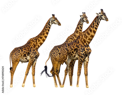 Fototapeta premium Three giraffes stand together against a dark backdrop, showcasing their...