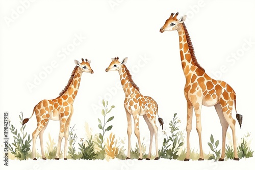 © kombet, Fototapeta premium Three giraffes standing among greenery in a whimsical illustration.