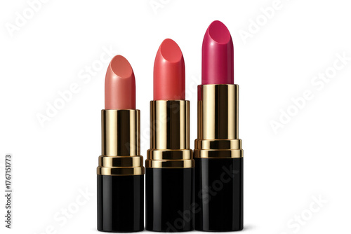 Obraz premium Three glamorous lipsticks in varying shades standing on transparent background
