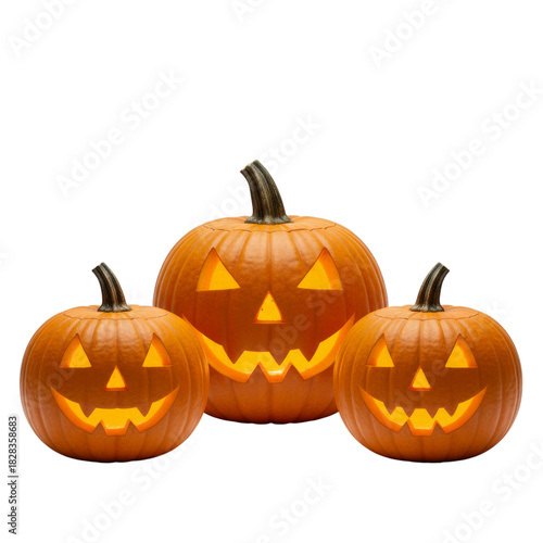 © Jobeda, Fototapeta premium Three Glowing Jack-o'- Lanterns for Halloween pumpkin