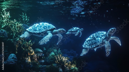 © Lycee, Fototapeta premium Three glowing sea turtles swim gracefully through the ocean water
