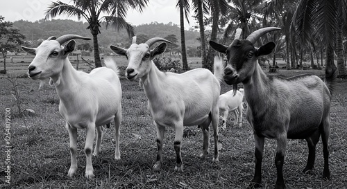 Obraz premium Three Goats in a Tropical Paradise: Black and White Photography