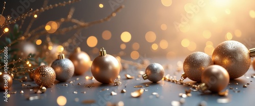 Fototapeta premium Three gold and blue Christmas ornaments on a blue background. The gold ornaments are larger than the blue ones