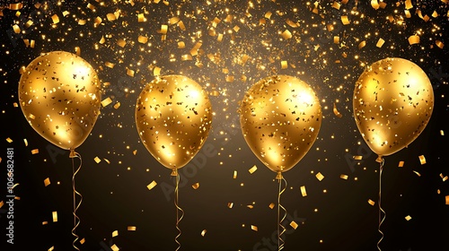 Obraz premium Three Golden Balloons with Confetti on a Black Background