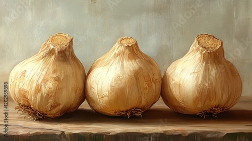 Obraz premium Three golden onions arranged on a rustic wooden surface, showcasing their...