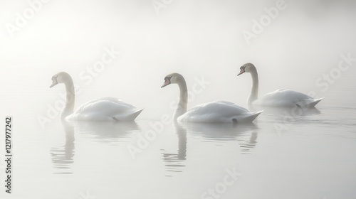 © Windi, Fototapeta premium Three graceful swans swim in misty water.