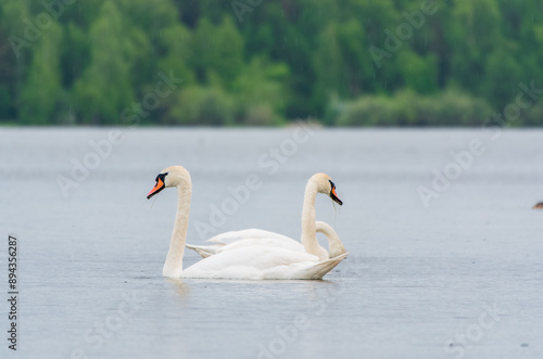 © Dmitrii Potashkin, Fototapeta premium Three graceful white swans swims in the lake, swans in the wild.