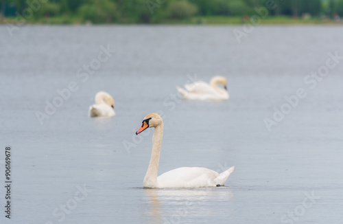 Fototapeta premium Three graceful white swans swims in the lake, swans in the wild.