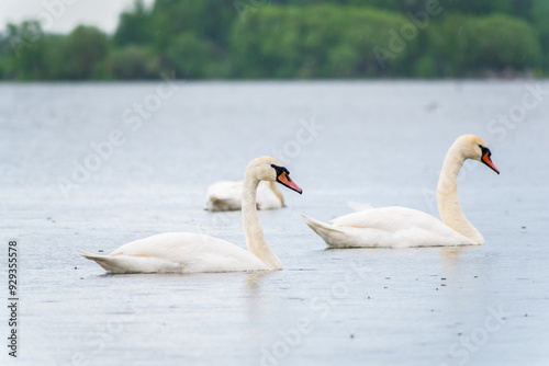 Fototapeta premium Three graceful white swans swims in the lake, swans in the wild.